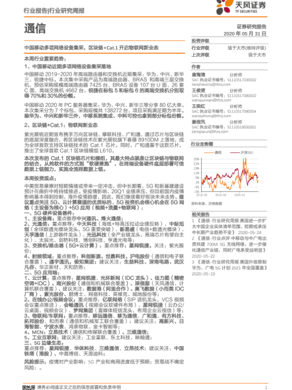 【天风证券】【20200531】通信行业研究周报:中国移动多项网络设备集采,区块链+Cat.1开启物联网新业态-14页 行业研究