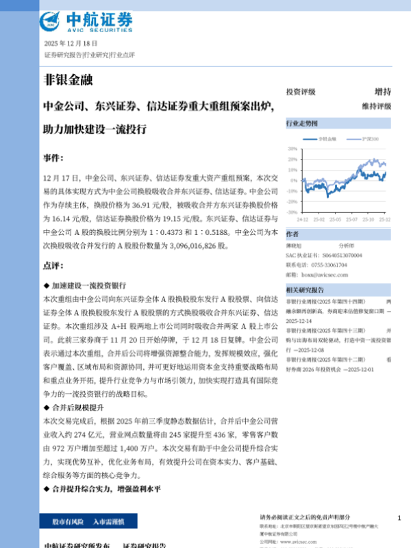 【中航证券】【202512】非银金融:中金公司、东兴证券、信达证券重大重组预案出炉,助力加快建设一流投行-3页 证券期货研究报告