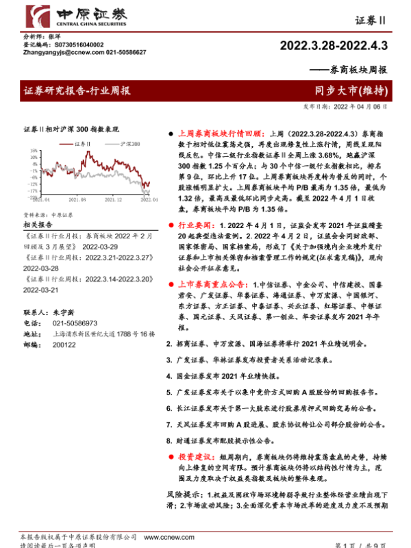 【中原证券】【20220406】券商板块周报-9页 行业研究
