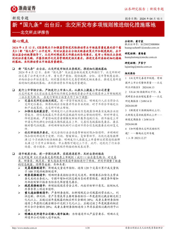 【浙商证券】【20240415】北交所点评报告:新“国九条”出台后,北交所发布多项规则推进细化措施落地-20页 行业研究