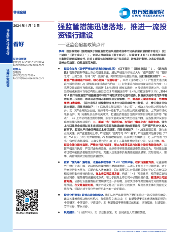 【申万宏源】【20240413】非银金融行业证监会配套政策点评:强监管措施迅速落地,推进一流投资银行建设-14页 行业研究