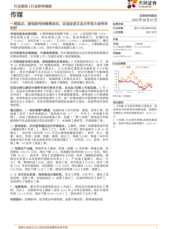 【天风证券】【20220807】传媒一周观点:游戏版号持续常态化,证监会发文及元宇宙大会带来利好-14页 行业研究