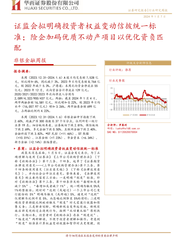 【华西证券】【20240107】非银金融周报:证监会拟明确投资者权益变动信披统一标准;险企加码优质不动产项目以优化资负匹配-14页 行业研究
