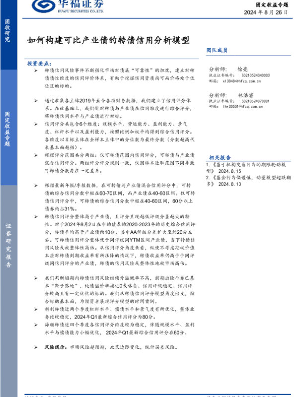 【华福证券】【20240826】固定收益专题:如何构建可比产业债的转债信用分析模型-9页 行业研究