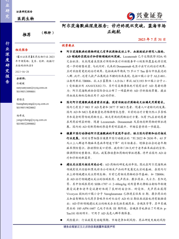 【兴业证券】【20230731】阿尔茨海默病深度报告:诊疗终现双突破,蓝海市场正起航-35页 行业研究