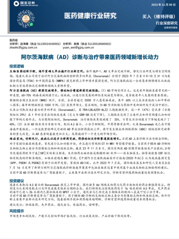 【国金证券】【20231109】医药健康行业:阿尔茨海默病(AD)诊断与治疗带来医药领域新增长动力-21页 行业研究