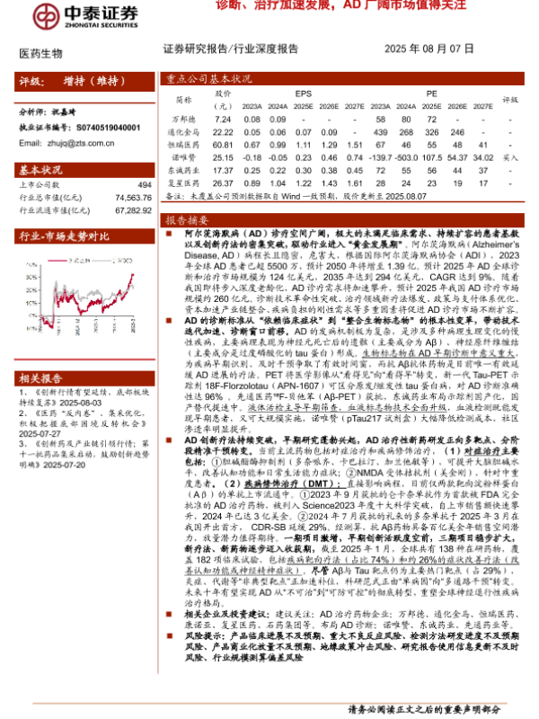 【中泰证券】【20250807】医药生物行业:诊断、治疗加速发展,AD广阔市场值得关注-37页 证券期货研究报告