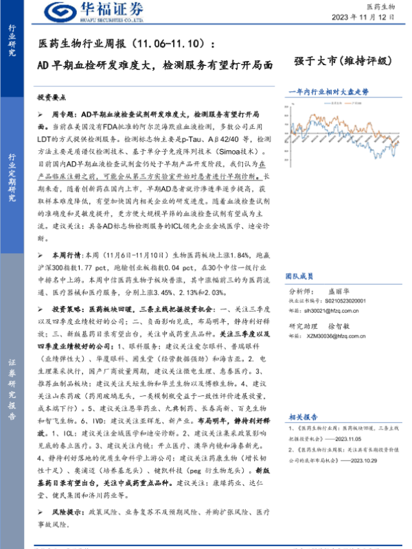 【华福证券】【20231112】医药生物行业周报:AD早期血检研发难度大,检测服务有望打开局面-12页 行业研究