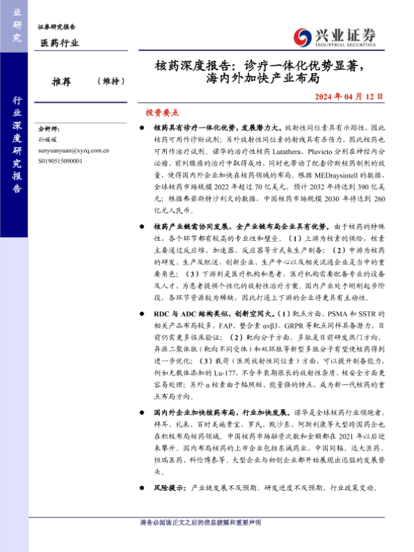 【兴业证券】【20240412】医药行业核药深度报告:诊疗一体化优势显著,海内外加快产业布局-50页 行业研究