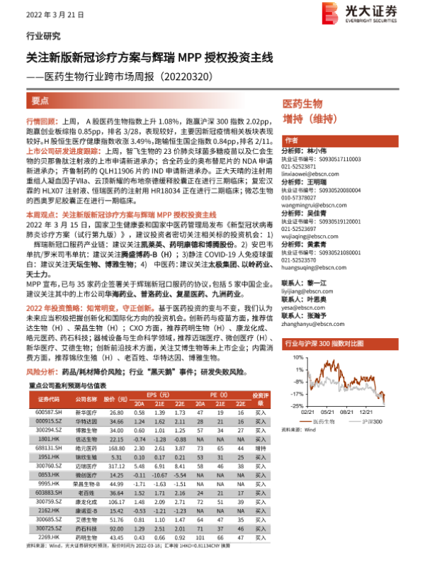 【光大证券】【20220321】医药生物行业跨市场周报:关注新版新冠诊疗方案与辉瑞MPP授权投资主线-24页 行业研究