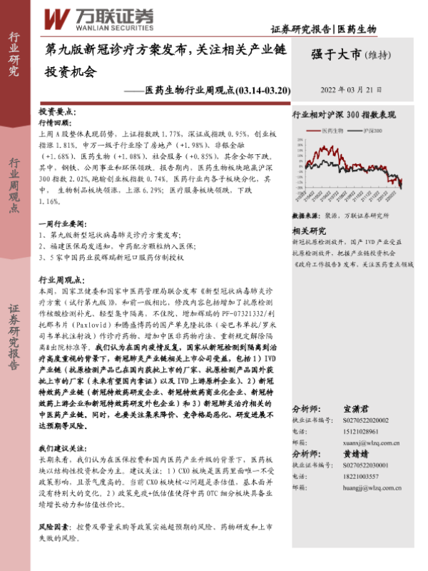 【万联证券】【20220321】第九版新冠诊疗方案发布,关注相关产业链投资机会-11页 行业研究