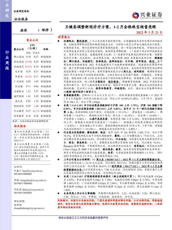【兴业证券】【20220321】社会服务行业周报:卫健委调整新冠诊疗方案,1-2月金银珠宝销售亮眼-15页 行业研究