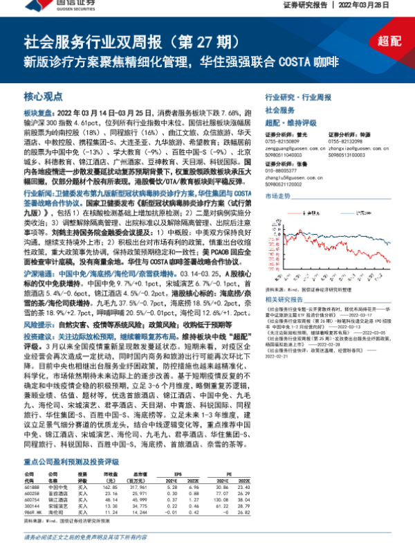 【国信证券】【20220328】社会服务行业双周报(第27期):新版诊疗方案聚焦精细化管理,华住强强联合COSTA咖啡-11页 行业研究