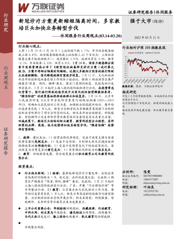 【万联证券】【20220321】新冠诊疗方案更新缩短隔离时间,多家教培巨头加快业务转型步伐-10页 行业研究