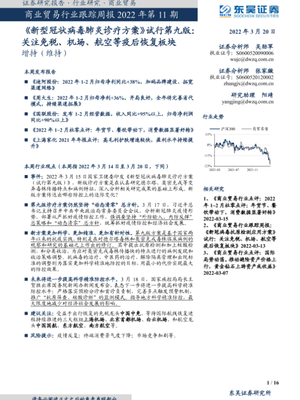【东吴证券】【20220320】商业贸易行业跟踪周报2022年第11期:《新型冠状病毒肺炎诊疗方案》试行第九版:关注免税、机场、航空等疫后恢复板块-16页 行业研究