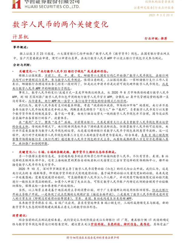 【华西证券】【20210323】计算机行业:数字人民币的两个关键变化-4页 行业研究