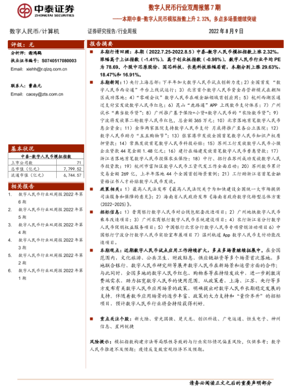 【中泰证券】【20220809】20220809-中泰证券-数字人民币行业双周报第7期:本期中泰-数字人民币模拟指数上升2.32%,多点多场景继续突破-11页 行业研究