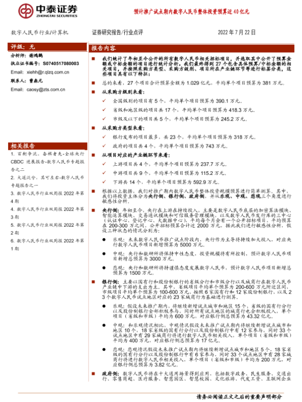 【中泰证券】【20220722】20220722-中泰证券-数字人民币行业:预计推广试点期内数字人民币整体投资预算近40亿元-4页 行业研究