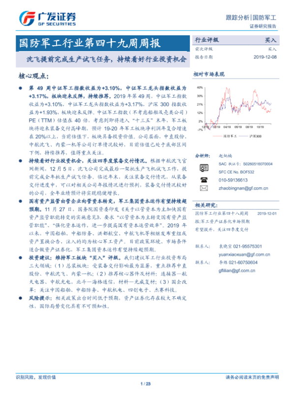 【广发证券】【20191208】国防军工行业第四十九周周报:沈飞提前完成生产试飞任务,持续看好行业投资机会-23页 行业研究