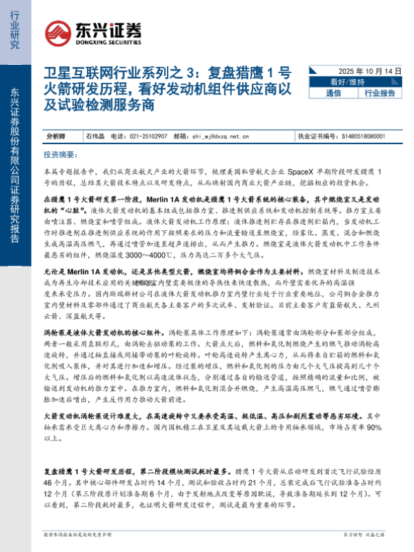 【东兴证券】【202510】卫星互联网行业系列之3:复盘猎鹰1号火箭研发历程,看好发动机组件供应商以及试验检测服务商-17页 证券期货研究报告