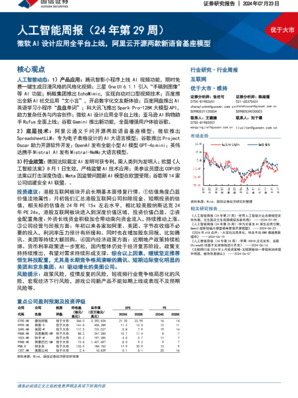 【国信证券】【20240723】20240723-国信证券-人工智能周报(24年第29周):微软AI设计应用全平台上线,阿里云开源两款新语音基座模型-13页 行业研究