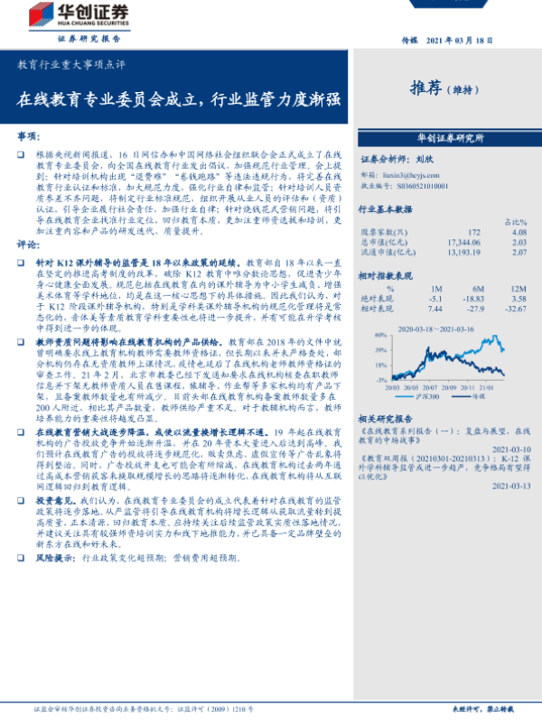 【华创证券】【20210318】教育行业重大事项点评:在线教育专业委员会成立,行业监管力度渐强-3页 行业研究