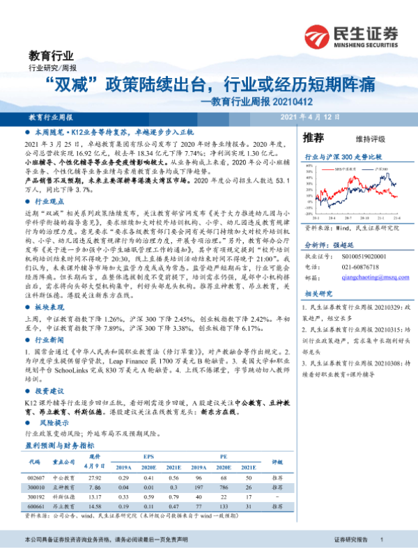 【民生证券】【20210412】教育行业周报 20210412:“双减”政策陆续出台,行业或经历短期阵痛-12页 行业研究