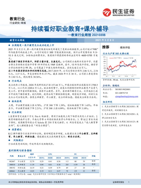 【民生证券】【20210308】20210308-民生证券-教育行业周报:持续看好职业教育+课外辅导-12页 行业研究