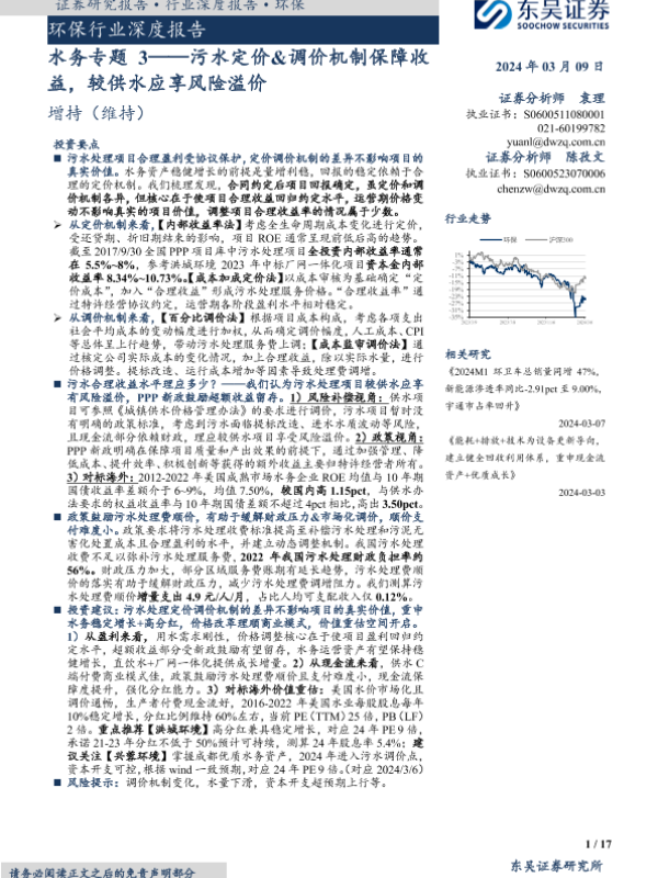 【东吴证券】【20240309】环保行业深度报告:水务专题3-污水定价&调价机制保障收益,较供水应享风险溢价-17页 行业研究