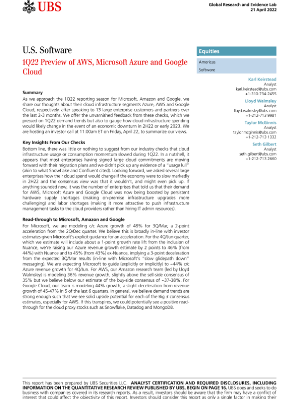 【瑞银】【20220421】瑞银-美股软件行业-2022年第1季度AWS、微软Azure和谷歌云预览-25页 行业研究