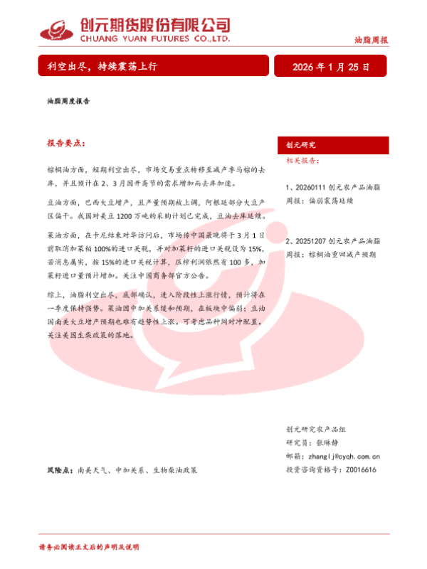 【创元研究】【202601】油脂周度报告-19页 证券期货研究报告