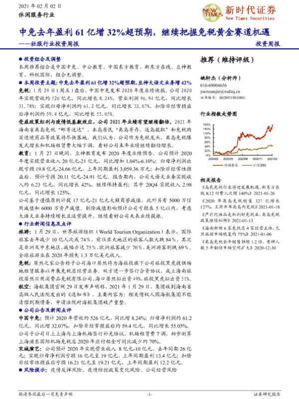 【新时代证券】【20210202】社服行业投资周报:中免去年盈利61亿增32%超预期,继续把握免税黄金赛道机遇-18页 行业研究