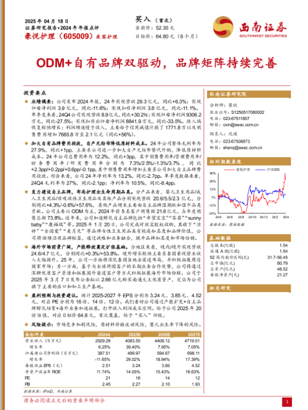 【西南证券】【20240418】豪悦护理(605009)2024年年报点评:ODM+自有品牌双驱动,品牌矩阵持续完善-18页 证券期货研究报告