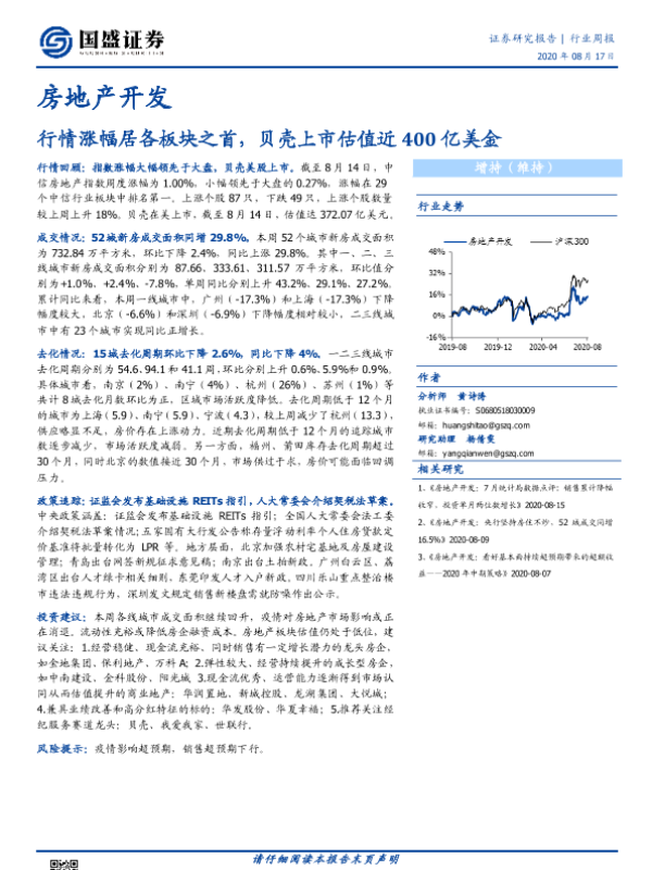 【国盛证券】【20200817】房地产开发行业周报:行情涨幅居各板块之首,贝壳上市估值近400亿美金-19页 行业研究