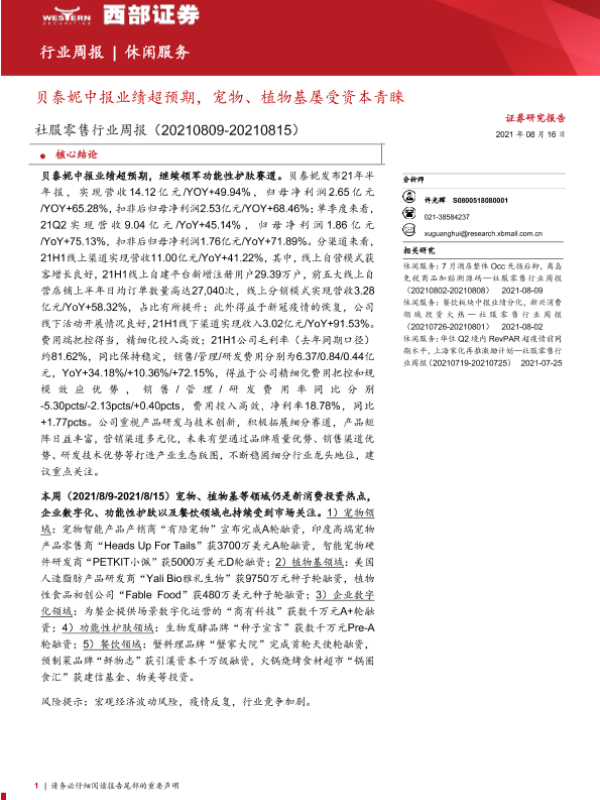 【西部证券】【20210816】社服零售行业周报:贝泰妮中报业绩超预期,宠物、植物基屡受资本青睐-13页 行业研究