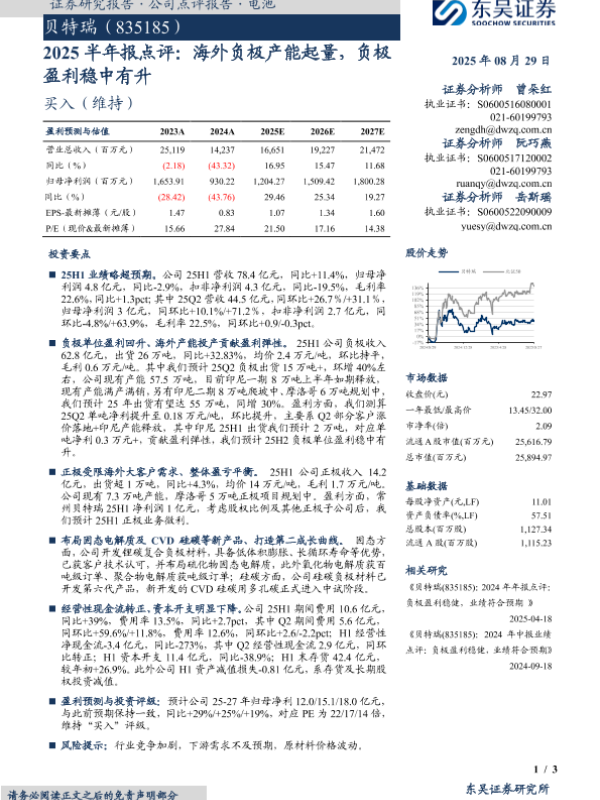【东吴证券】【20250829】贝特瑞(835185)-2025半年报点评:海外负极产能起量,负极盈利稳中有升-3页 证券期货研究报告