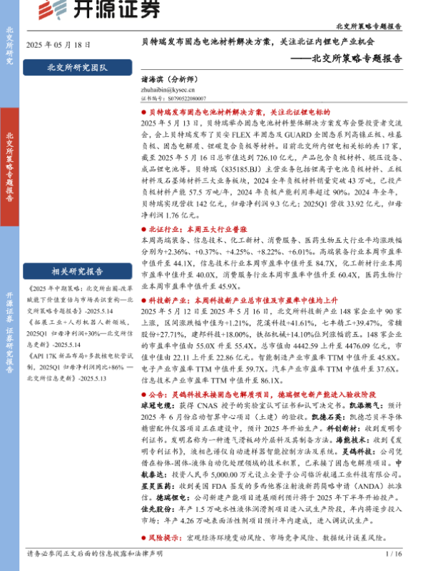 【开源证券】【20250518】北交所策略专题报告:贝特瑞发布固态电池材料解决方案,关注北证内锂电产业机会-16页 证券期货研究报告