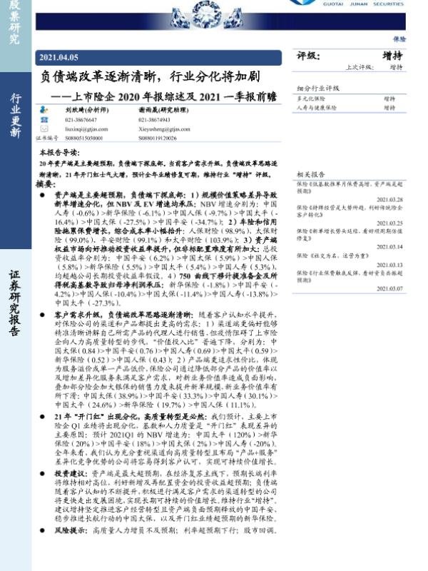 【国泰君安证券】【20210405】上市险企2020年报综述及2021一季报前瞻-负债端改革逐渐清晰,行业分化将加剧-18页 行业研究