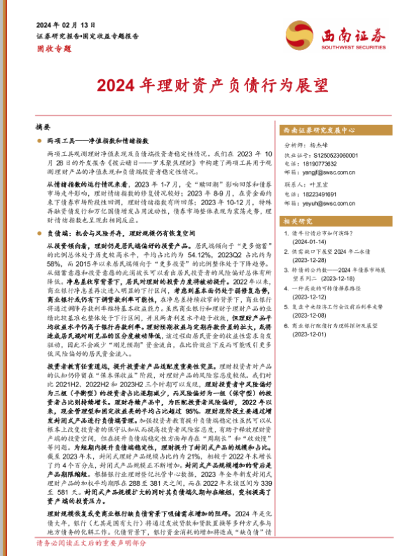 【西南证券】【20240213】固收专题:2024年理财资产负债行为展望-24页 行业研究