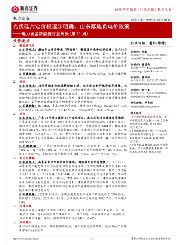 【浙商证券】【20230319】电力设备新能源行业周报(第11周):光伏硅片定价权逐步明确,山东落地负电价政策-37页 行业研究