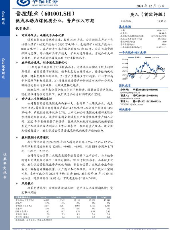 【华福证券】【20241213】晋控煤业(601001)低成本动力煤优质企业,资产注入可期-22页 行业研究