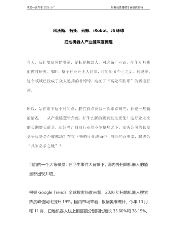 【并购优塾】【20210107】科沃斯、石头、云鲸、iRobot、JS环球:扫地机器人产业链深度梳理-26页 行业研究