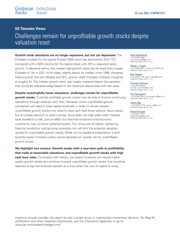 【Goldman Sachs】【20220725】Challenges remain for unprofitable growth stocks despite valuation reset-13页 行业研究
