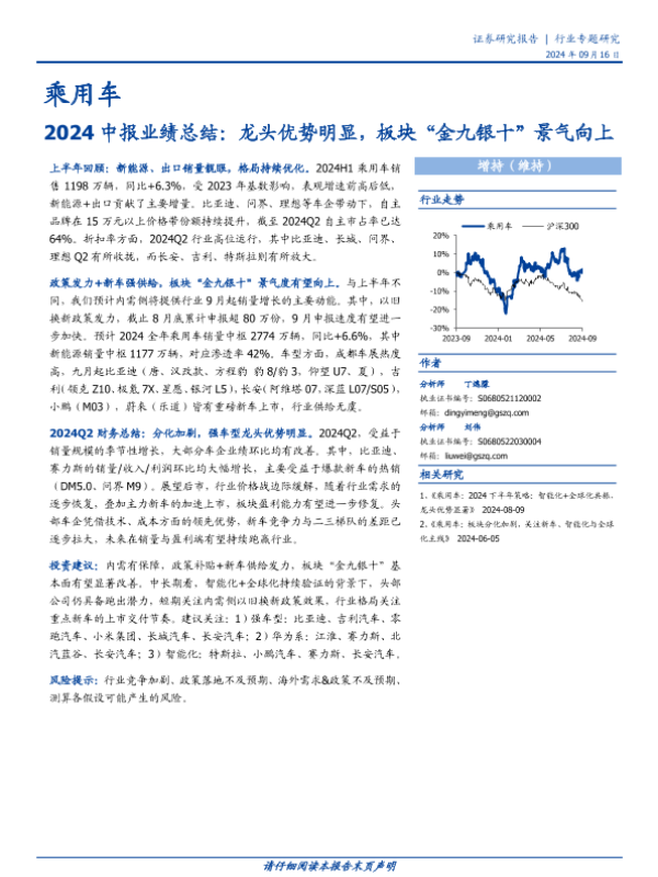 【国盛证券】【20240916】乘用车行业2024中报业绩总结:龙头优势明显,板块“金九银十”景气向上-10页 行业研究