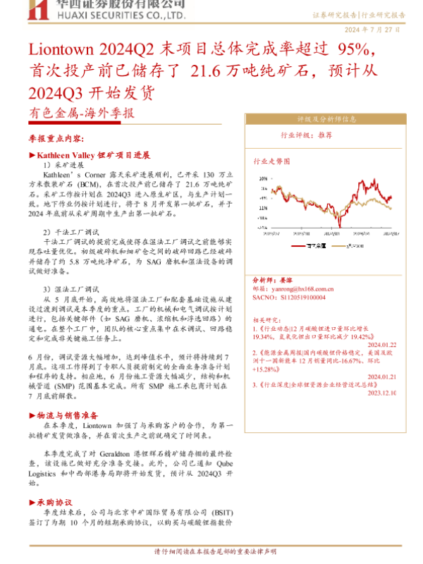 【华西证券】【20240727】华西证券-有色金属-海外季报:Liontown 2024Q2末项目总体完成率超过95%,首次投产前已储存了21.6万吨纯矿石,预计从2024Q3开始发货-12页 行业研究