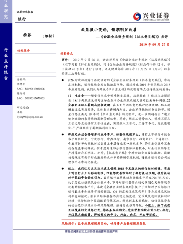 【兴业证券】【20190927】政策微小变动,预期明显改善——《金融企业财务规划(征求意见稿)》点评-6页 行业研究