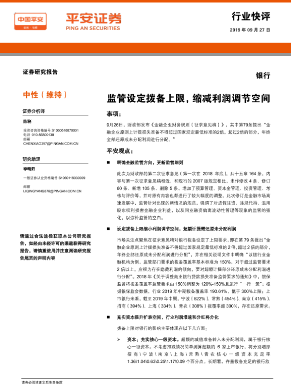 【平安证券】【20190927】银行行业快评:监管设定拨备上限,缩减利润调节空间-5页 行业研究