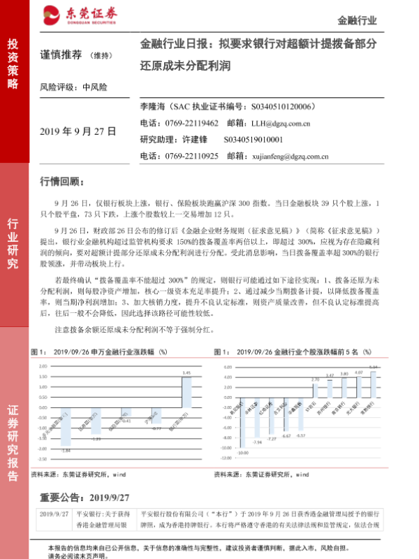 【东莞证券】【20190927】金融行业日报:拟要求银行对超额计提拨备部分还原成未分配利润-4页 行业研究
