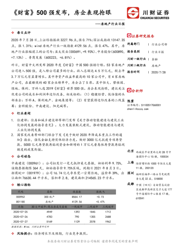 【川财证券】【20200728】房地产行业日报:《财富》500强发布,房企表现抢眼-3页 证券期货研究报告
