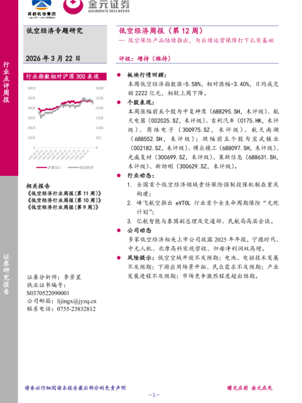 【金元证券】【202603】低空经济周报(第12周):低空保险产品陆续推出,为后续运营保障打下扎实基础-9页 证券期货研究报告